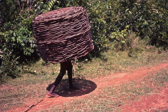 | 211. Large wicker baskets like this one en route to the market are used to move or store produce in bulk. Larger ones still are used as corn cribs and roofed with thatch. |