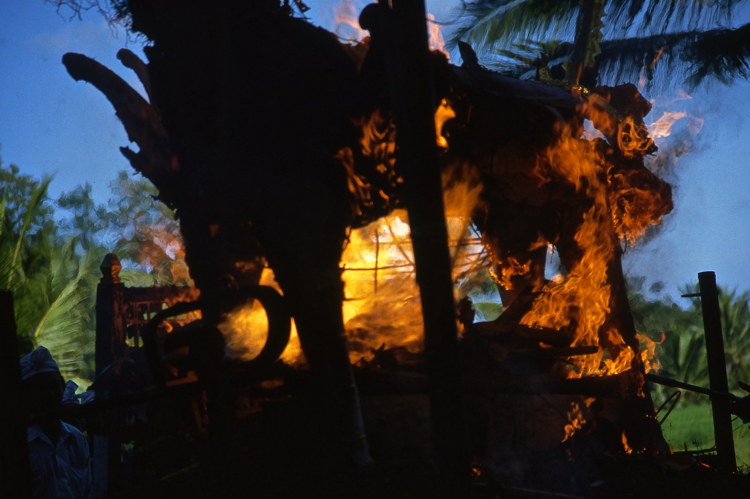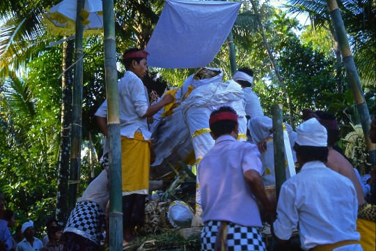119. In Bali every stage in life is marked by a ceremony, and the greatest ceremony of all comes at the end … and it’s expensive. Preparing for a cremation therefore takes years sometimes, and the body will be buried till required. It will be washed, wrapped in a white burial sheet, and interred in the village cemetery … till the mourners have enough money and the priest has chosen the exact astrological date for the reincarnation of the soul of the deceased. |