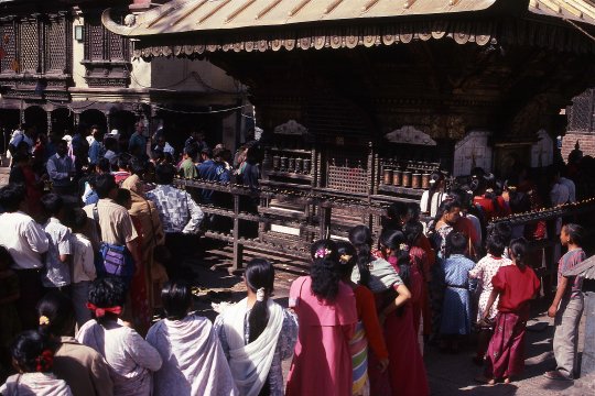 | 124. Large numbers of people stood in line outside the temple awaiting their turn to enter and pay homage. |