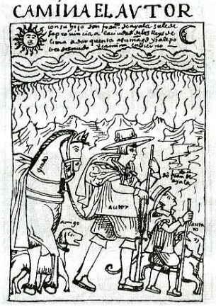 128. The other authentic early record of daily life in the Inca Empire, and its decline and fall, is contained in the chronicles of Guaman Poma quoted many times already. He was born in 1535, also the son of an Inca princess and another conquistador, and he travelled widely around Peru. Here he walks with his son to go to Lima to hand over his illustrated chronicle, which was 30 years in the making. |