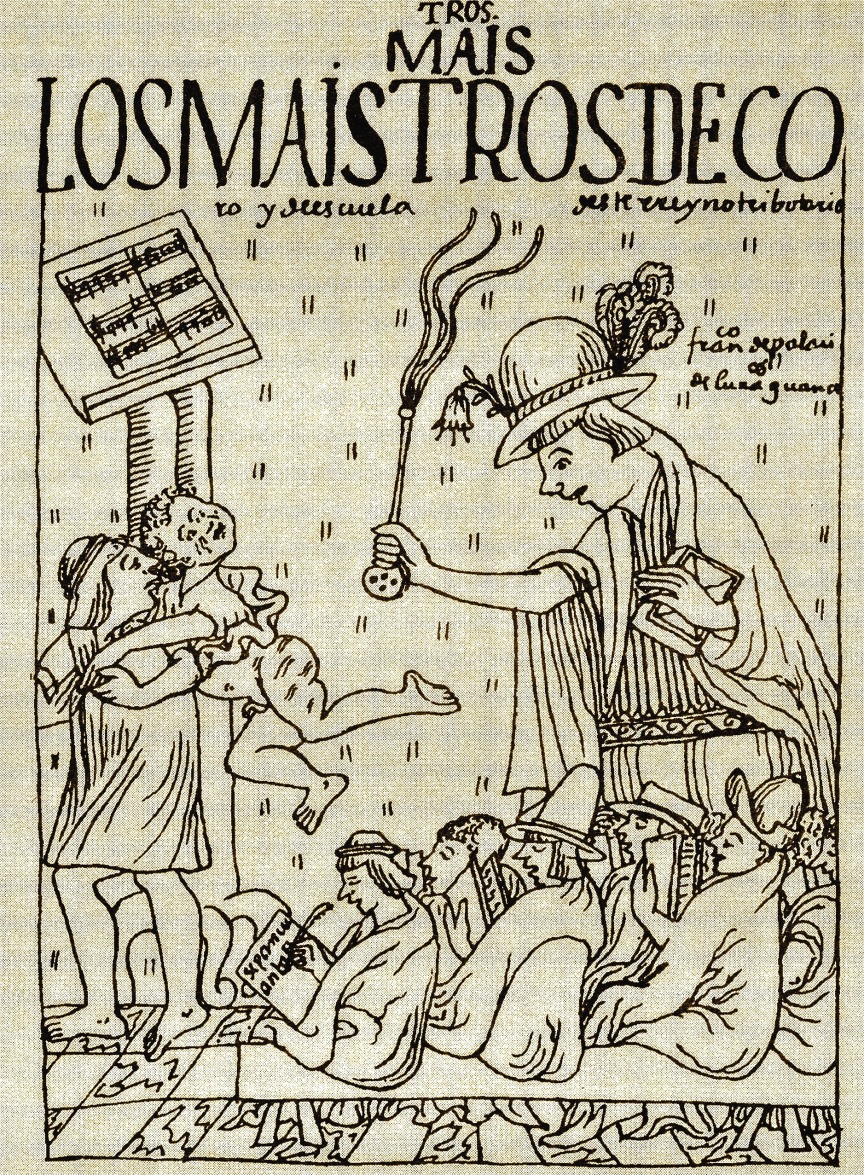 131. Poma illustrates the horrendous treatment of maids, the beating of children, forced marriages, and priests playing cards with the magistrates. Boys were to be taught in schools and girls at home. They were to be taught to read and write and to sing, “in order to be good Christians”. The same chronicle also records details of the daily life of “the Indians”, especially their systems of food production (documented in frames 109-111). |
