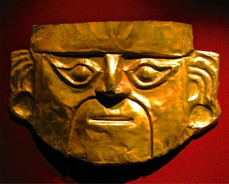 132. Gold and silver were not used as currency, as nothing could be bought or sold in the kingdom. Instead they were esteemed for their beauty, as being suitable for the decoration of temples and palaces and the Inca himself. Initially the Spanish enjoyed easy pickings, removing gold and silver from both palaces and temples. Later, however, the Spanish Crown created a regime under which the king commanded the conquistadors, who were now charged with evangelizing the Indians! (Gold mask in the Larco Museum) |