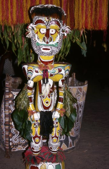 | 340.The heavy slit gongs or garamuts are positioned at one end of the building, and are decorated with the totem of the moiety. |
